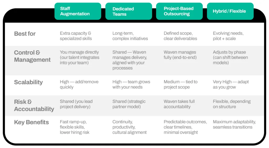 Choose staff augmentation, outsourcing, dedicated teams, or a hybrid. All presented in one simple comparison table.
